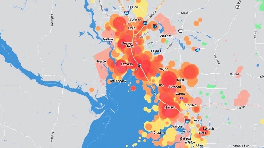 - Pay attention to color-coded zones—red indicates widespread outages, yellow for localized issues, and green for normal service.